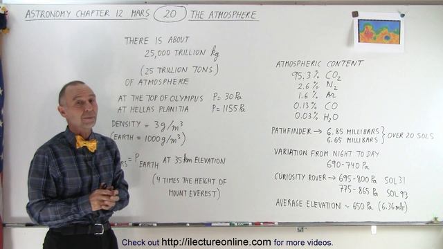 Visit http://ilectureonline.com for more math and science lectures! To donate: http://www.ilectureonline.com/donate https://www.patreon.com/user?u=3236071 We will learn about the atmosphere of Mars: its contents, how much does it weigh, the atmospheric pressure at its highest and lowest point, its density, etc… Previous video in this series can be seen at: https://youtu.be/BqE53CzR8CE Next video in this series can be seen at: https://youtu.be/IHUENBQJJLE