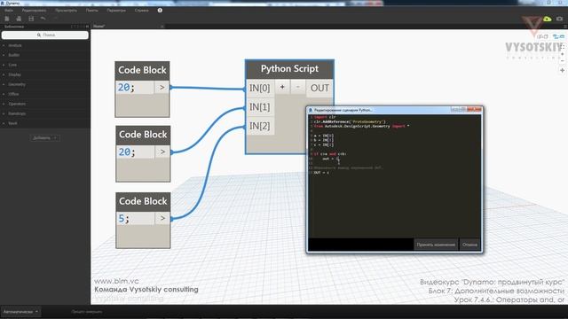 Задание нескольких условий одной строкой с помощью логических операторов AND (“и”) и OR (“или”). Пример определения того, попадает ли заданное число в диапазон двух других чисел. Ноды: Python Script, Code Block Урок из видеокурса «Dynamo: Продвинутый уровень». Средний. Дополнительные материалы доступны на портале: https://bim.vc/edu/courses/dynamo-prodvinutyy-uroven/ Автор курса: Сергей Кривой — Ведущий системный аналитик | ПИК Digital | Автор Полный список бесплатных видеокурсов: https://bim.vc/edu/courses/ Другие популярные бесплатные курсы: Autodesk Revit Архитектура: https://bim.vc/edu/courses/autodesk-revit-arkhitektura-prodvinutyy-uroven/ Autodesk BIM 360: https://bim.vc/edu/courses/autodesk-bim-360-prodvinutyy-kurs/ Autodesk Revit Семейства: https://bim.vc/edu/courses/autodesk-revit-semeystva-prodvinutyy-uroven/ Autodesk Revit Электрика Продвинутый: https://bim.vc/edu/courses/autodesk-revit-elektrika-prodvinutyy-uroven/ Autodesk Revit ОВ/ВК: https://bim.vc/edu/courses/autodesk-revit-mep-prodvinutyy-uroven/ Dynamo: https://bim.vc/edu/courses/dynamo-prodvinutyy-uroven/ BIM-менеджмент: https://bim.vc/edu/courses/bim-menedzher-administrirovanie-i-sovmestnaya-rabota/ Autodesk Navisworks: https://bim.vc/edu/courses/autodesk-navisworks-bazovyy-uroven/ Подпишитесь на новости, чтобы сразу узнавать о новых материалах: https://vk.com/bimvc https://www.facebook.com/bimvc/ https://t.me/bimvc/ О компании: Vysotskiy consulting с 2012 развивает BIM-кадры: Для частных лиц мы публикуем бесплатные курсы, тесты и формируем открытые профили на bim.vc. По ним вы можете получить новые знания, подтвердить их в экзаменах, сформировать открытый профиль и найти работу мечты. Компании могут оценить знания сотрудников и соискателей в удобной и наглядной среде — определить сильных и тех, кого нужно доучить. Также мы проводим корпоративные курсы, являемся авторизованным учебным центром Autodesk и Bentley, имеем статус «BIM-лидер Россия 2021». Среди клиентов — ПИК, Росатом, Рив Гош, AECOM и множество других корпораций, гос. компаний и холдингов. Для вузов мы разрабатываем уникальные учебные программы, совмещающие развитие навыков BIM-менеджмента и soft-skills. По всем вопросам сотрудничества обращайтесь по адресу: contact@bim.vc К сожалению, в связи с большой рабочей загрузкой мы не имеем возможности отвечать на комментарии к урокам, но мы будем благодарны за обратную связь и идеи по улучшению материала. Расскажите, полезен ли был материал? Получилось ли повторить опыт автора? А может быть, у вас есть альтернативный опыт, которым вы можете поделиться?