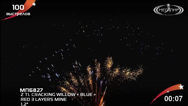 МПБ827 Веерный фейерверк 100 залпов калибром 1,2 дюйма CRACKING WILLOW + BLUE + RED 3 LAYERS MINE