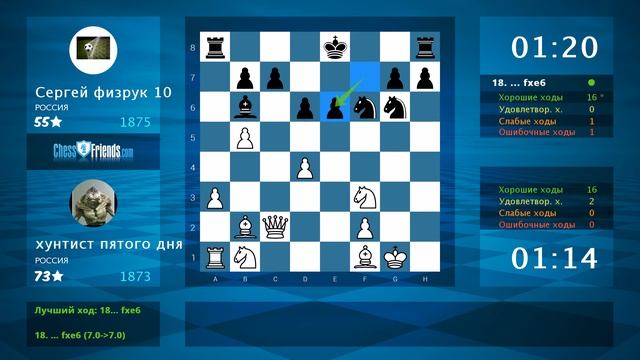 Данное видео было создано мобильным приложением ChessFriends.com **** Понравилось видео? Вы тоже можете создавать такие видео! Просто установите наше приложение, играйте и экспортируйте игры прямо в YouTube. Android: https://play.google.com/store/apps/details?id=chessfriends.online.chess iOS: https://itunes.apple.com/app/chess-online-+/id903978215?mt=8 Windows 8/10: http://apps.microsoft.com/windows/app/ajedrez-online/362ae1c9-5d6f-4824-a9e7-1095b2a95e10 OSX: https://itunes.apple.com/app/chess-online-+/id919607238?l=en&mt=12 Мобильный сайт: http://www.chessfriends.com/mobile?lang=ru_RU Facebook App: https://apps.facebook.com/chessfriendscom Windows Phone: http://apps.microsoft.com/windows/app/ajedrez-online/362ae1c9-5d6f-4824-a9e7-1095b2a95e10 **** Chess Age: Android: https://play.google.com/store/apps/details?id=chess.friends.game.play IOS: https://itunes.apple.com/us/app/chess-age/id1217007613?mt=8 Facebook: https://apps.facebook.com/chessage **** Подпишитесь на ChessFriends.com в YouTube: https://www.youtube.com/subscription_center?add_user=ChessFriendsDotCom Facebook: https://www.facebook.com/ChessFriendscom-127961610576613/?fref=ts **** Игра в формате PGN: [Event "free game"] [Site "www.chessfriends.com"] [Date "2021/10/29"] [Round "none"] [White "хунтист пятого дня"] [Black "Сергей физрук 10"] [Result "1-0"] [ECO "A00"] [Opening "Bugayev Attack, Polish"] [WhiteElo "1873"] [BlackElo "1875"] [WhiteCountry "RU"] [BlackCountry "RU"] [TimeControl "120000"] 1. b4 e5 2. a3 a6 3. c4 Nc6 4. b5 axb5 5. cxb5 Nce7 6. Bb2 Ng6 7. e3 Bc5 8. Qc2 d6 9. Nf3 Bg4 10. Be2 Nf6 11. h3 Be6 12. d4 exd4 13. exd4 Bb6 14. O-O Qd7 15. Re1 Bxh3 16. gxh3 Qxh3 17. Bf1+ Qe6 18. Rxe6+ fxe6 19. Nbd2 O-O 20. Ne4 Ng4 21. Nfg5 Rae8 22. Qd3 h6 23. Nh3 Nf4 24. Nxf4 Rxf4 25. f3 Nf6 26. Bc1 Rf5 27. Bh3 Rg5+ 28. Nxg5 hxg5 29. Bxg5 Rf8 30. Bxe6+ Kh8 31. Kg2 Nh5 32. Rh1 g6 33. Qxg6 Rg8 34. Rxh5# 1-0