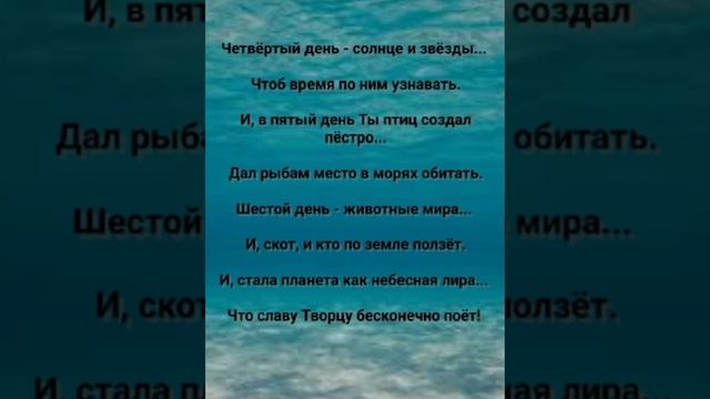 ХРИСТИАНСКИЕ ПЕСНИ ДЛЯ ХВАЛЫ ПОКЛОНЕНИЯ ПРОСЛАВЛЕНИЯ ЕВАНГЕЛИЗАЦИИ ДУХОВНОГО РОСТА ПРОБУЖДЕНИЯ ВОЗРОЖДЕНИЯ #господь#музыка#христианская_музыка#музика#христианскиепесни#бог#христианскиестихи#любовь#христианство#стихи#песня#песни#иисус#иисусхристос#иисусмойбог#иисус_христос#иисусбог#иисусгосподь#хвалы_и_поклонения#хваление#хвала#прославление#духсвятой#духовныйрост#духовноепробуждение#духовность#евангелие#евангелизация#евангельскаявесть#духовный_рост#пробуждение#рождество#рождествохристово#божий#божийнарод#божьеслово #ХристианскаяПесня #ХристианскоеПоклонение #ХристианскаяНоваяПесня #ПастырьМоейДушы #ХристианскаяМузыка #ПесняСлавы #Иисус #ЛюбовьБожья #ХристианскиеТексты #СлаваГосподу #ВераИПоклонение #ВечнаяЛюбовь #RussianChristianSong #RussianChristianWorship #RussianChristianMusic #RussianWorship #NewRussianChristianMusic #RussianChristianMusic #RussianSongOfPraise #Jesus #GodsLove #ChristianLyrics #GloryToGod #RussianFaithAndWorship #EternalLove #Пасха #Воскресение #ХристосВоскрес #пробуждение #возрождение https://stihi.ru/avtor... "ВСЁ, ЧТО ТЫ СОЗДАЛ - ПРЕКРАСНО!" СЛОВА, МУЗЫКА, ОБРАБОТКА: ЖАННА ВОЛКОВА-ВАРЛАМОВА https://stihi.ru/2025/... Стихи Жанна Юрьевна Волкова-Варламова Вступление: Земля была пуста и безвидна... И, тьма над глубокой водой. Но, Воля Твоя была очевидна... Ты дал ей порядок Святой. 1 Куплет День первый - и, свет появился... Отделив себя от ночей. День второй - небосвод сотворился... Став домом для ярких лучей. День третий - явилась суша... И, зелень покрыла её. Твои творения во благо нам служат... И, за это Тебе мы славу воздаём!!! Припев: Ты сотворил небо и землю... Ты звёзды зажёг в высоте. Твоей Благодати я внемлю... В великой земной красоте! От рыбы в морской глубине... До птицы, парящей вдали... Всё дышит Тобой на земле... Всё дышит по воле любви! 2 Куплет Четвёртый день - солнце и звёзды... Чтоб время по ним узнавать. И, в пятый день Ты птиц создал пёстро... Дал рыбам место в морях обитать. Шестой день - животные мира... И, скот, и кто по земле ползёт. И, стала планета как небесная лира... Что славу Творцу бесконечно поёт! Припев: Ты сотворил небо и землю... Ты звёзды зажёг в высоте. Твоей Благодати я внемлю... В великой земной красоте! От рыбы в морской глубине... До птицы, парящей вдали... Всё дышит Тобой на земле... Всё дышит по воле любви! Бридж И, вот венец всего творения... По образу сделан Твоему. Для жизни и для размножения... Чтоб править по слову всему. Припев: Ты сотворил небо и землю... Ты звёзды зажёг в высоте. Твоей Благодати я внемлю... В великой земной красоте! От рыбы в морской глубине... До птицы, парящей вдали... Всё дышит Тобой на земле... Всё дышит по воле любви! Заключение: И, всё, что Ты создал - прекрасно... И, вечер, и утро, и день. Твоё творение было не напрасно, Ты был им весьма вдохновен!!! 31.07.2025 Жанна Волкова-Варламова