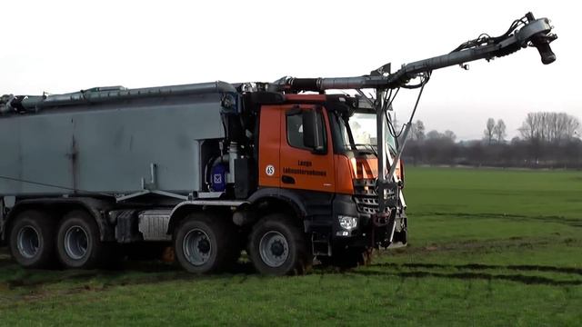Ein Video von Trecker Marc . Hier in Aktion beim ausbringen von Gärresten einer BGA ist ein Mercedes Benz Arocs 4151 4. Achs - LKW mit ein 30. m3 großen Eigenbau Tank u. Vogelsang VX Drehkolbenpumpe mit 27. m breiten Vogelsang Blackbird Schleppschuhgestänge auf Getreidefeldern unterwegs und bekommt Nachschub von 2. Mercedes Benz LKW - Gespannen (Arocs u. Actros ) mit jeweils Kässbohrer Tankaufliegern .