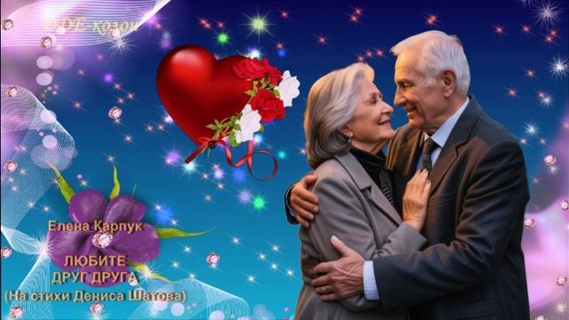 Любите друг друга, За то, что вы есть, За то что вы рядом, За то, что вы здесь. Любите друг друга, Всегда без причины, Плевать на года, Плевать на морщины. https://muzcard.ru/otkritka-love/item/3036-elena-karpuk-lyubite-drug-druga