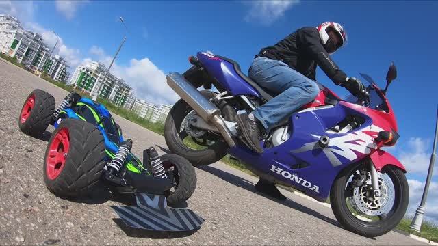 Машинка на пульте против мотоцикла