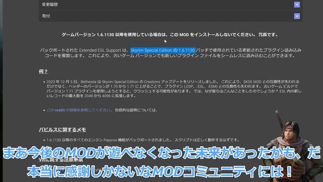 MOD列伝も今回で74回目! スカイリムMOD列伝は38回目! 我がチャンネル・シリーズの再生リストはこちら!! スカイリムMOD列伝シリーズ https://youtube.com/playlist?list=PLikJ175-oZAM10TgcZ67raBYXVmsPFEoM 他MOD列伝シリーズ https://youtube.com/playlist?list=PLikJ175-oZAO1QXKpSUlsN6EsBaHYNiiT&si=eRvTRvBv2E5S9kKH ご支援用サイトはこちら! https://www.amazon.jp/hz/wishlist/ls/23F2UOCM36EX9?ref_=wl_share 昨日から始まった年末年始怒涛の6連発動画投稿! 今回はスカイリムのターンが回ってきたぞ! 今回は弟分であるスターフィールドと同じく今年度最大最強のMOD! 今年度の一番人気MODは、なんだ!? しかも第三のENBと呼ぶべきMODまでが存在するではないか! これはランキング関係なく見逃せねえ! そのMODの名はッ! Community Shaders! そしてランキングに名を刻んだMOD達も紹介だ! ・コミュニティシェーダー降臨!すげえ光源だ! ・かかし化とは永劫脱却! ・こんなにかわいい装備がこの世にあったのか!?目線足らず! この動画を見れば夢見た最高のゲームの雛形が手に入る! 是非ともこの動画とシリーズを活用してもらえたら幸いだ! あなたとスカイリムを語るために活動しているだからな!! チャンネル登録、コメント、高評価 何時でも待っているぞ!それが何よりの支えになるのだ!! 紹介した環境 スチーム版 スカイリムSE版ダウングレード 1.5.97.0 紹介したPCスペック グラボ 4070ti CPU 13400f メモリ 32ギガ 補足動画 ロードオーダー自動並び替えツールLOOT https://youtu.be/t1uu1l_96S0 2次元MOD!こちらにボディスライサーの解説もあり! https://youtu.be/5DEtMpa1d-E ーー紹介した数々のツールとMODーー Elmlock Armor and Blade (CBBE - HIMBO) https://www.nexusmods.com/skyrimspecialedition/mods/105930 Elmlock Armor - Color Variants https://www.nexusmods.com/skyrimspecialedition/mods/107603 Community Shaders https://www.nexusmods.com/skyrimspecialedition/mods/86492 SSE Parallax Shader Fix (BETA) https://www.nexusmods.com/skyrimspecialedition/mods/31963 Thicc Lighting - Reshade Preset For Community Shaders https://www.nexusmods.com/skyrimspecialedition/mods/100763 Improved Camera SE https://www.nexusmods.com/skyrimspecialedition/mods/93962 Roxie the mad cbbe 3ba standalone goblin warrior follower https://www.nexusmods.com/skyrimspecialedition/mods/107606 (若干アダルトなので注意だ!) Backported Extended ESL Support https://www.nexusmods.com/skyrimspecialedition/mods/106441 Gryphonknight Regalia - Breton Noble Armor (optional SMP) https://www.nexusmods.com/skyrimspecialedition/mods/107437 Ashtoreth Black Hellebore 3BA and BHUNP HDT-SMP https://www.nexusmods.com/skyrimspecialedition/mods/107768 Animation Queue Fix https://www.nexusmods.com/skyrimspecialedition/mods/82395 Fantasia Landscapes https://www.nexusmods.com/skyrimspecialedition/mods/107256 Open Animation Replacer https://www.nexusmods.com/skyrimspecialedition/mods/92109 #スカイリム #skyrim #オススメMOD #美化
