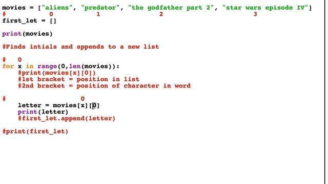 This video will show you how a for loop can be used to iterate through a list of items and print out the first character from each item. I have also hashed out code in the video which would add those letters to a new list, but not shown the process for this here. The code could also be amended to find the first (or any) letter in a string.