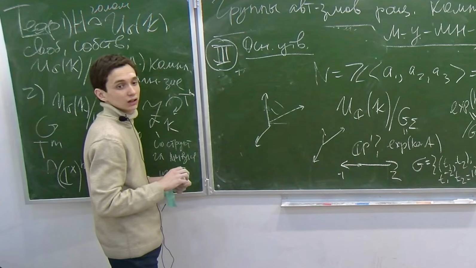 17.03.25 Докладчик: Михаил Николаевич Шенгелия Тема: Группы автоморфизмов рациональных комплексных момент-угол-многообразий. Аннотация доклада: В торической геометрии важную роль играет фактор-конструкция Батырева-Кокса, согласно которой торическое многообразие V_Σ, заданное симплициальным веером Σ, представляется в виде пространства орбит действия квазитора G на открытом подмножестве U аффинного пространства. Эта конструкция позволяет, при дополнительном требовании полноты веера, получить описание группы автоморфизмов V_Σ в терминах некоторой короткой точной последовательности. Подобное построение существует и в торической топологии. А именно, момент-угол-комплекс Z_K выбором симплициального веера с подлежащим симплициальным комплексом K и комплексной подгруппы Ли H в алгебраическом торе, удовлетворяющей определённым условиям, представляется в виде U/H и снабжается тем самым структурой комплексного многообразия с каноническим слоением F. В случае, когда веер Σ рационален, F замыкается в расслоение над торическим многообразием V_Σ со слоем комплексный компактный тор G/H. Изучая это расслоение, мы дадим описание связной компоненты единицы группы биголоморфных автоморфизмов Z_K, аналогичное тому, что имеет место для торических многообразий. Также будут предложены примеры, демонстрирующие различные случаи, которые возникают при попытке описать дискретную часть группы автоморфизмов. Страница курса - https://mccme.ru/ru/nmu/courses-of-nmu/vesna-20242025/s25-sem-panov/ Руководитель - Тарас Евгеньевич Панов Это видео и другие смотрите на канале RuTube - https://rutube.ru/channel/42881756/