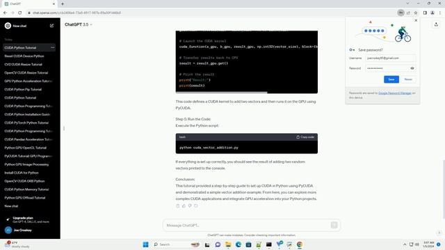 Instantly Download or Run this code online at https://codegive.com Title: Getting Started with CUDA in Python: A Comprehensive Tutorial with Code Examples Introduction: CUDA (Compute Unified Device Architecture) is a parallel computing platform and programming model developed by NVIDIA for general-purpose computing on GPUs. In this tutorial, we will explore how to use CUDA in Python to accelerate your computations. We'll cover installation, basic concepts, and provide code examples to help you get started. Prerequisites: Step 1: Install CUDA Toolkit and cuDNN: Visit the official NVIDIA website (https://developer.nvidia.com/cuda-downloads) to download and install the CUDA Toolkit. Additionally, you may want to install cuDNN for deep learning applications. Step 2: Install PyCUDA: PyCUDA is a Python wrapper for CUDA, providing easy access to CUDA functionality from Python. Install it using pip: Step 3: Verify CUDA Installation: Before diving into Python, ensure that CUDA is correctly installed by checking the version: Step 4: Write Your First CUDA Python Code: Let's create a simple CUDA program that adds two vectors. Create a file, e.g., cuda_vector_addition.py, and add the following code: This code defines a CUDA kernel to add two vectors and then runs it on the GPU using PyCUDA. Step 5: Run the Code: Execute the Python script: If everything is set up correctly, you should see the result of adding two random vectors printed to the console. Conclusion: This tutorial provided a step-by-step guide to set up CUDA in Python using PyCUDA and demonstrated a simple vector addition example. From here, you can explore more complex CUDA applications and integrate GPU acceleration into your Python projects. ChatGPT